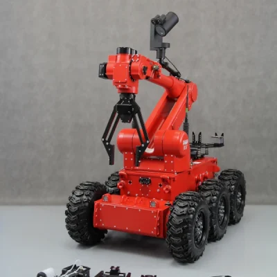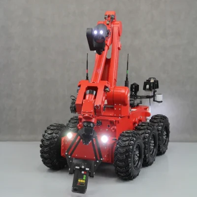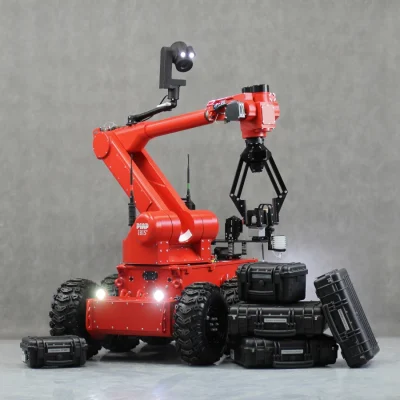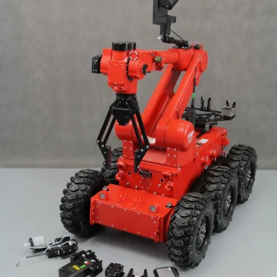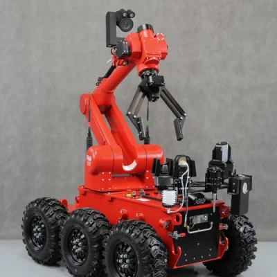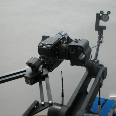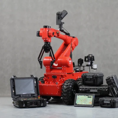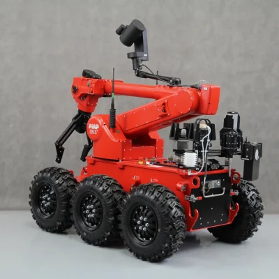 Six-wheeled chassis with independent drive of each wheel allows to operate in challenging and varied terrain. PIAP IBIS® is a fast robot (10 km/h). Special design of mobile base suspension ensures optimum wheel contact with the ground. Manipulator with extendable arm ensures a large reach (over three meters) and a high range of motion in each plane.